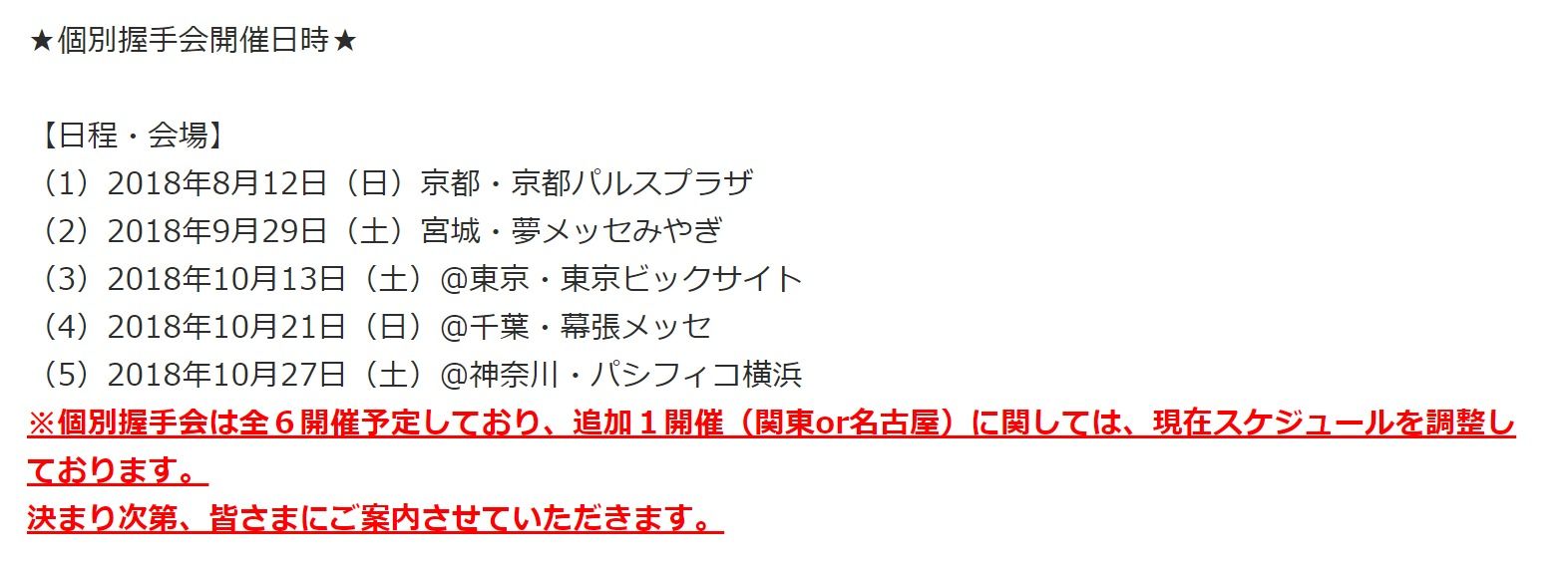 ※個別握手会は全6開催予定しており、追加1開催(関東or名古屋)に関しては、現在スケジュールを調整しております。
