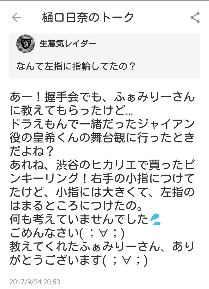 樋口日奈の薬指に指輪が・・・【乃木坂46】 2017年12月15日 カテゴリ:樋口 日奈 1: 君の名は@まとめたいよ 2017年9月13日(ツイッターの投稿日) 皇希「ひなも観にきてくれたんだよー」 2017年9月24日(755の投稿日) ヲタ「なんで左指に指輪してたの?」 日奈「あれね、渋谷のヒカリエで買ったピンキーリング! 右手の小指につけてたけど、小指には大きくて、左指のはまるところにつけたの」 2017年12月14日(インスタの投稿日) 柚子「写真は1年前の今日撮ったもの」 樋口日奈の薬指に指輪が・・・【乃木坂46】の続きを読む タグ :#樋口日奈