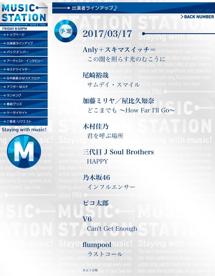3/17(金) ミュージックステーションに乃木坂46が出演!インフルエンサーを披露する模様! 2017年03月10日 カテゴリ:歌番組 881: 君の名は(アラビア) (ワッチョイW 239e-3fbj) 2017/03/10(金) 17:15:39.80 ID:fxP8Iwb90 3/17(金) ミュージックステーション Anly+スキマスイッチ= 「この闇を照らす光のむこうに」 尾崎裕哉 「サムデイ・スマイル」 加藤ミリヤ/屋比久知奈 「どこまでも ~How Far I'll Go~」 木村佳乃 「君を呼ぶ場所」 三代目 J Soul Brothers 「HAPPY?」 乃木坂46 「インフルエンサー」 ピコ太郎 V6 「Can't Get Enough」 flumpool 「ラストコール」 3/17(金) ミュージックステーションに乃木坂46が出演!インフルエンサーを披露する模様!の続きを読む タグ :#ミュージックステーション#インフルエンサー
