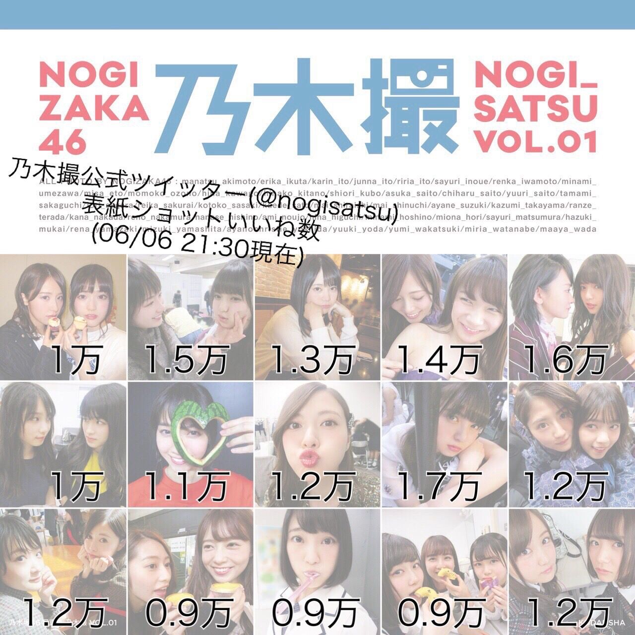 乃木撮“表紙ショット“『Twitter反響ランキング』がこちら!!!【乃木坂46】 2018年06月06日 カテゴリ:写真集・雑誌 1: 君の名は@まとめたいよ 乃木撮公式ツイッター(@nogisatsu) 06/05夜投稿→06/06 21:30現在のいいね数 1.7万 飛鳥 1.6万 生駒飛鳥 1.5万 飛鳥高山 1.4万 秋元白石 1.3万 生田 1.2万 白石/生駒白石/西野若月/北野星野 1.1万 西野 1万 衛藤松村/大園与田 0.9万 優里桜井/堀/伊藤佐藤山下 楽天ブックス:乃木坂46写真集 乃木撮 VOL.01 [ 乃木坂46 ]セブンネット: 乃木坂46写真集 乃木撮 VOL.01 乃木撮“表紙ショット“『Twitter反響ランキング』がこちら!!!【乃木坂46】の続きを読む タグ :#乃木撮#ランキング