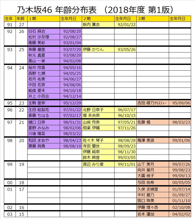 次の成人式も興味深い…『2018年度メンバー年齢分布表』がこちら!!!【乃木坂46】 2018年04月01日 カテゴリ:考察 28: 君の名は@まとめたいよ2018年度 乃木坂46 年齢分布表 成人式 :和田まあや、齋藤飛鳥、佐々木琴子、寺田蘭世、伊藤純奈、鈴木絢音、梅澤美波 高校卒業:与田祐希 中学卒業:岩本蓮加 今年度の成人式メンバーもなかなか興味深いね 次の成人式も興味深い…『2018年度メンバー年齢分布表』がこちら!!!【乃木坂46】の続きを読む タグ :#年齢