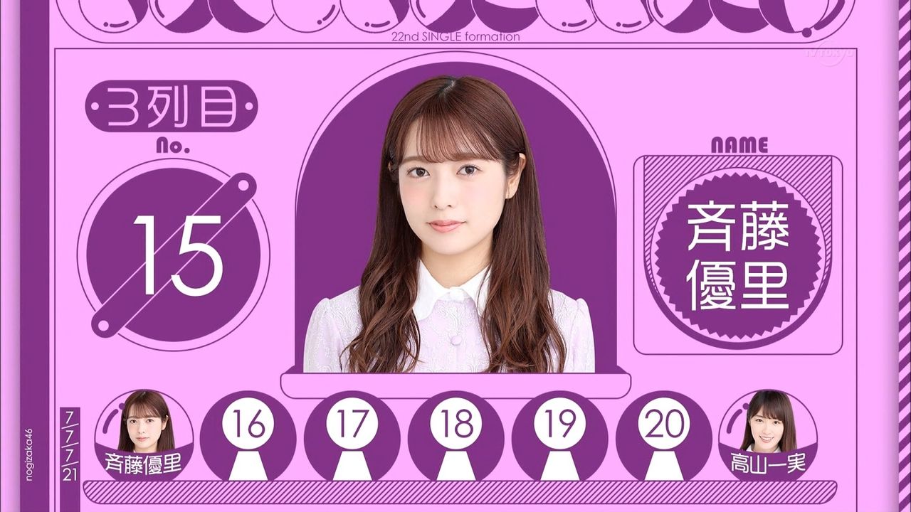 22ndで新たに選抜入りするメンバーって誰なの? 2018年09月30日 カテゴリ:考察 1: 君の名は@まとめたいよ 乃木坂工事中 09/30 24:00~24:30 「バナナ全国ツアー裏側潜入&シングル選抜発表」 【番組内容】 今夜の乃木坂工事中は、バナナマンが「真夏の全国ツアー2018」宮城公演の裏側潜入ロケ後半戦! バナナが影アナ初挑戦&メンバーが撮った舞台裏ムービーも公開 そしていよいよ本番!メンバー自らプロデュースした今回の公演だけのユニット曲の出来栄えは? 22枚目シングルの選抜メンバー発表!新たに抜擢されたメンバーは? 西野がメンバーに卒業を報告。白石が西野卒業への思いを語る 22ndで新たに選抜入りするメンバーって誰なの? の続きを読む タグ :#22ndシングル#選抜